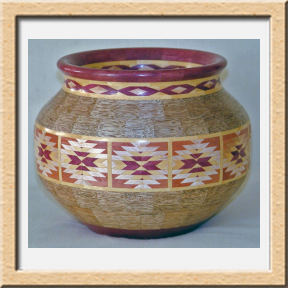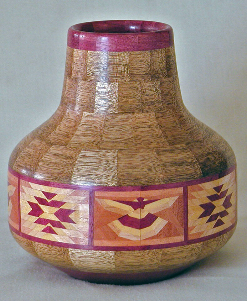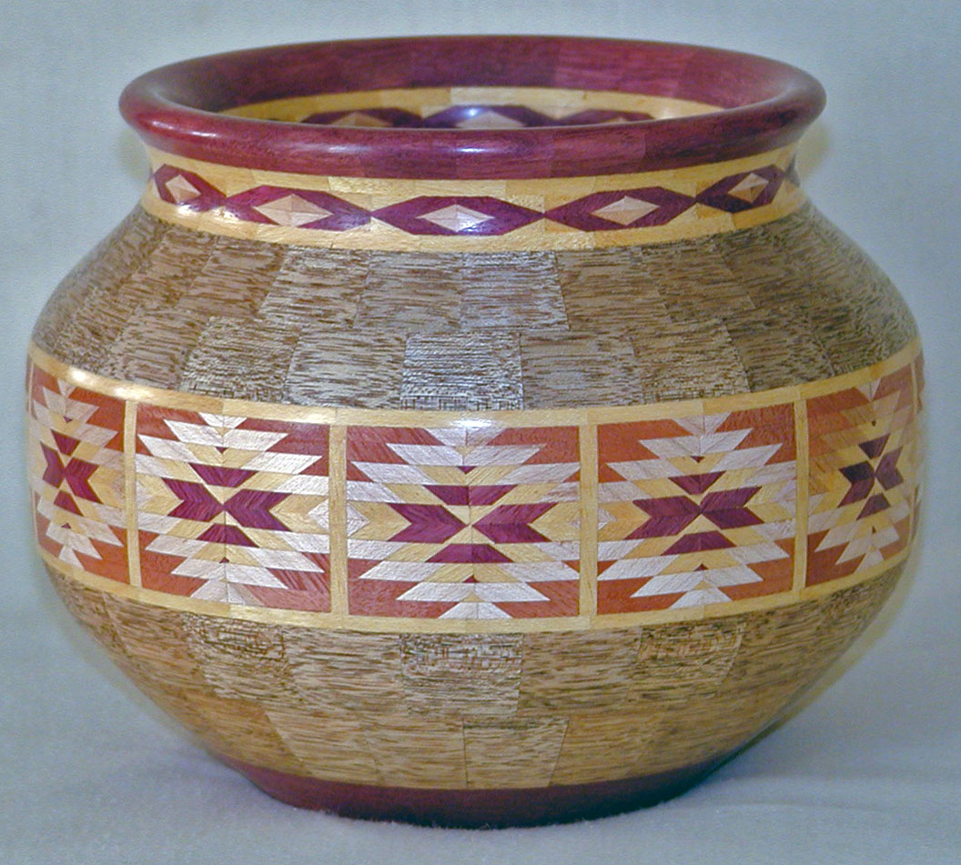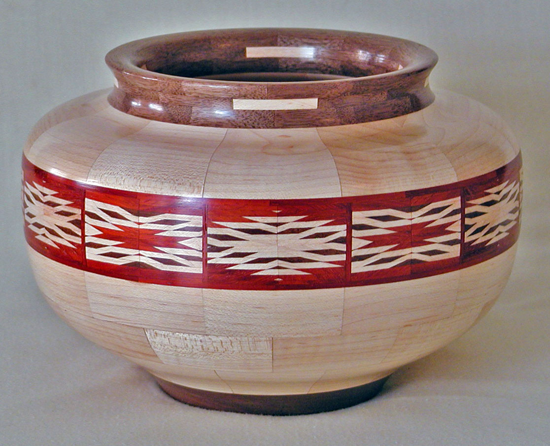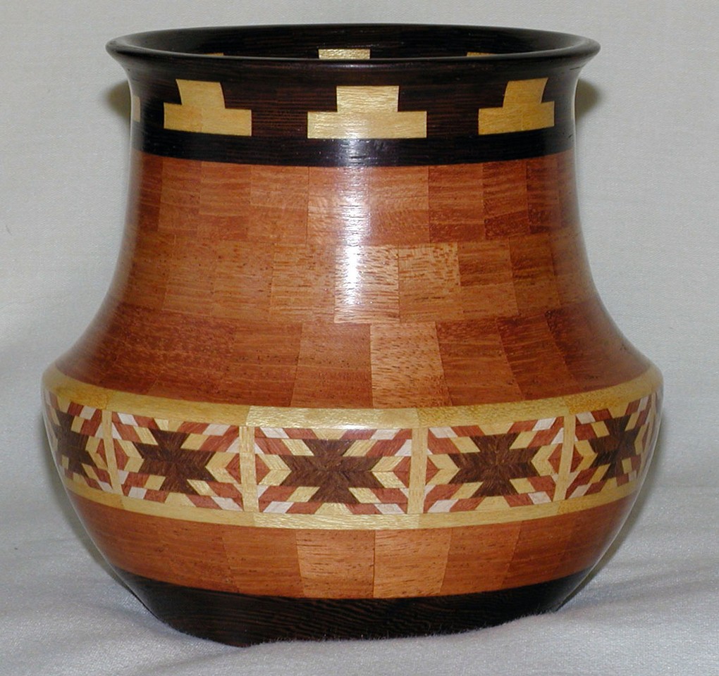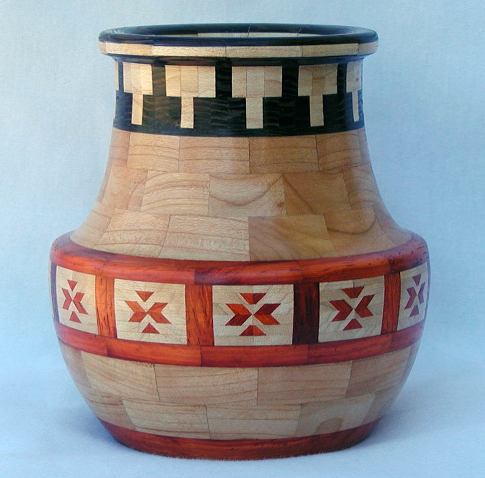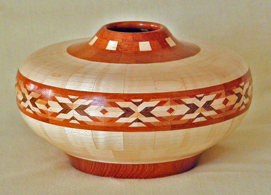 I have been asked many times about how the southwest design feature rings in many of these segmented vessels were created. The process includes quite a bit of cutting, gluing and clamping but it is actually a much easier process than most people imagine. I created a simple web page that demonstrates the general principles used to construct these southwest patterns, so check it out if you want to explore using the technique in your own woodworking adventures.