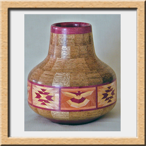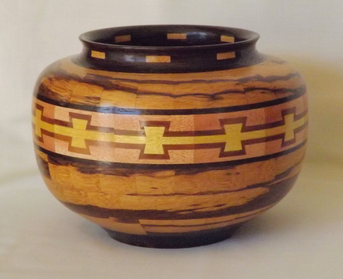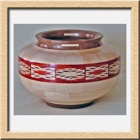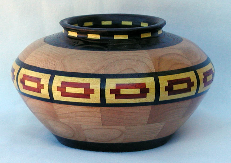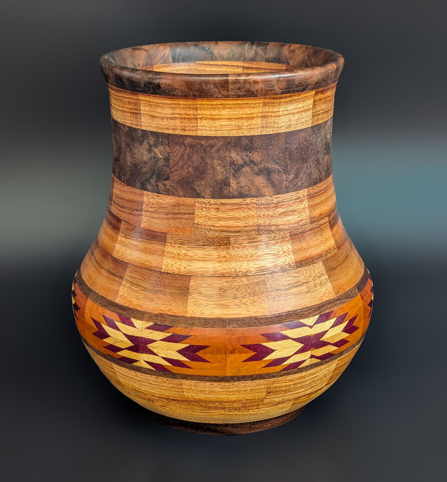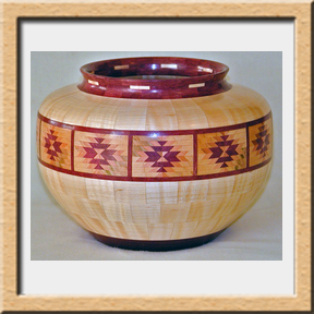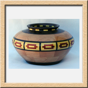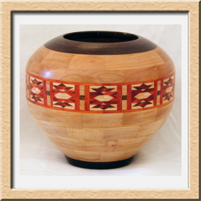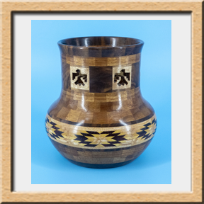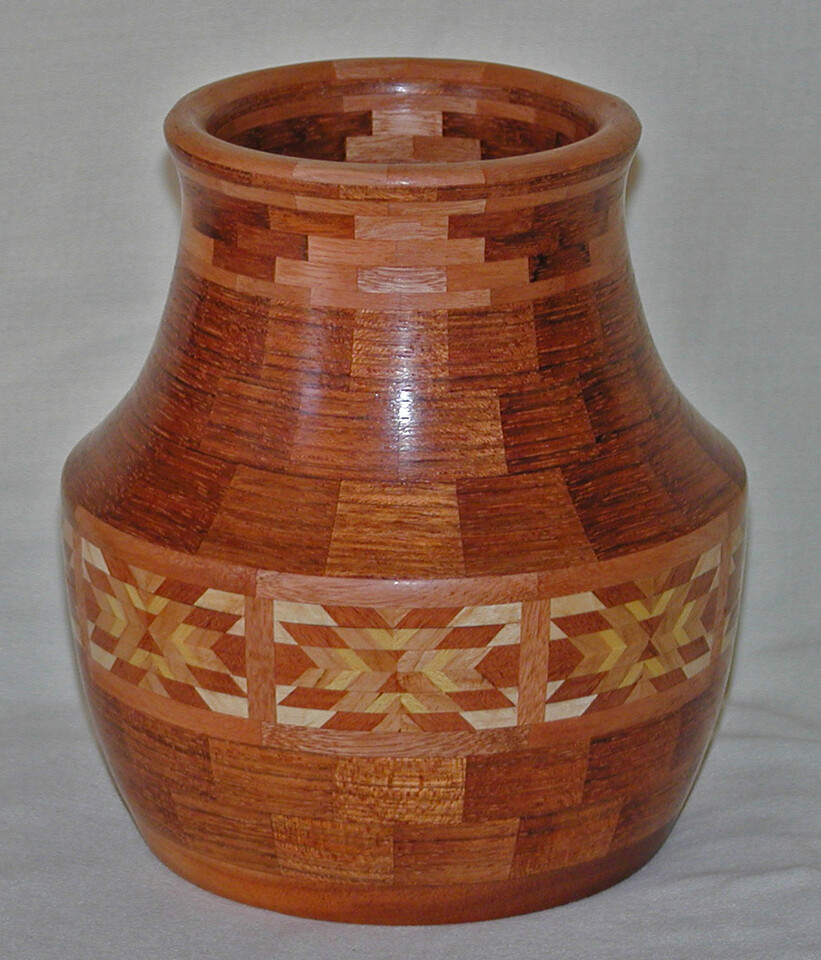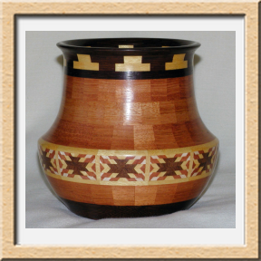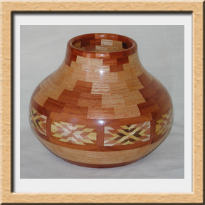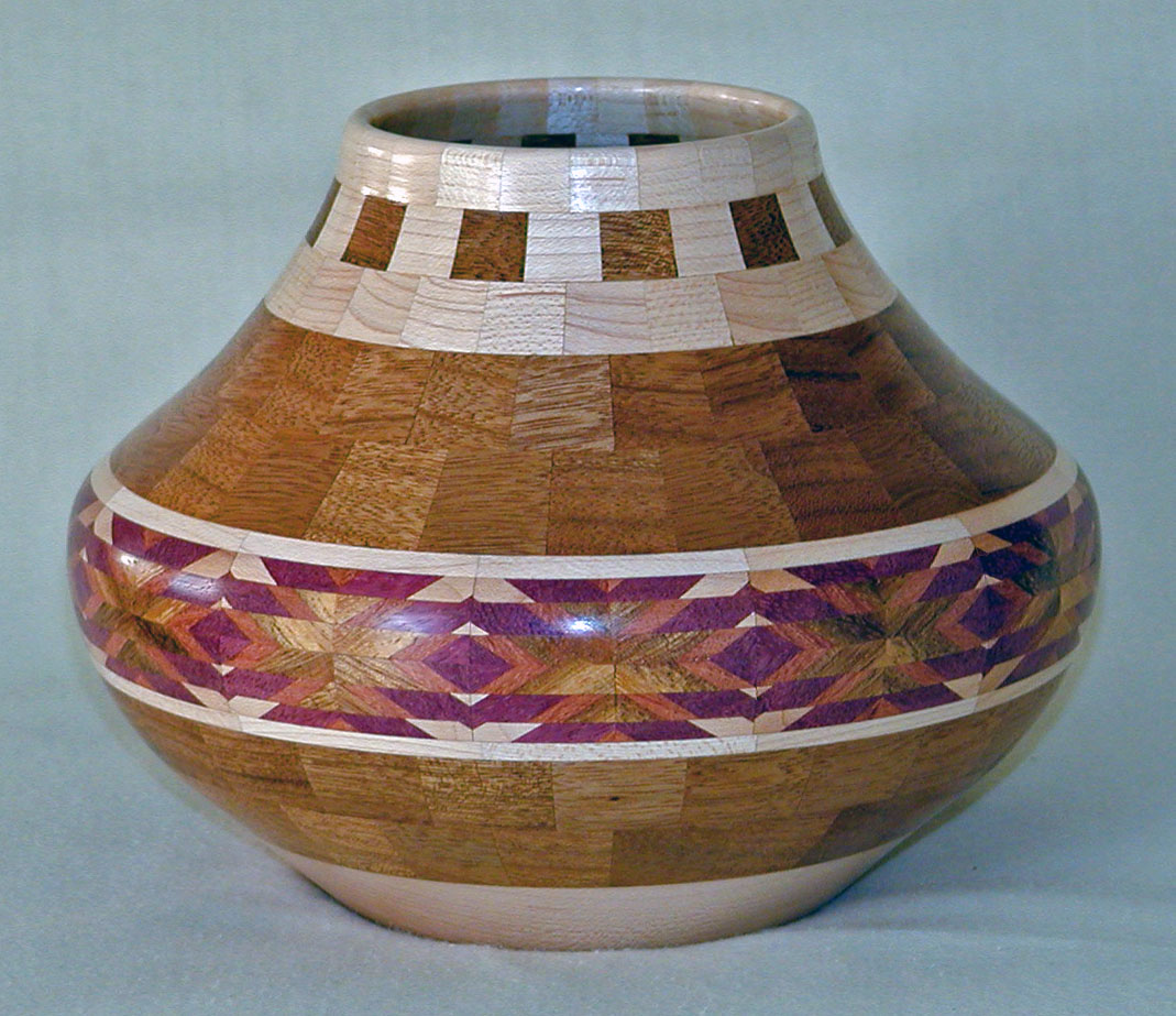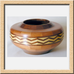 I have been asked many times about how the southwest design feature rings in many of these segmented vessels were created. The process includes quite a bit of cutting, gluing and clamping but it is actually a much easier process than most people imagine. I created a simple web page that demonstrates the general principles used to construct these southwest patterns, so check it out if you want to explore using the technique in your own woodworking adventures.