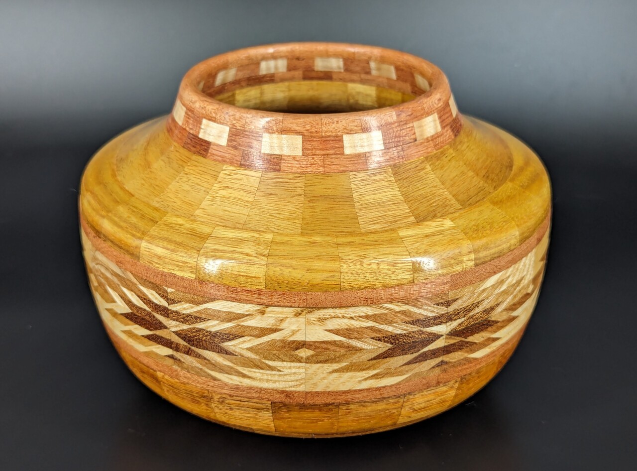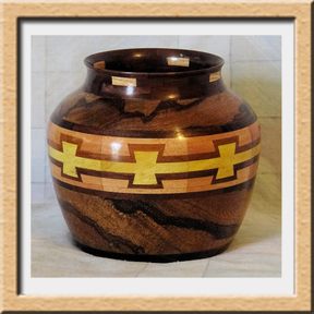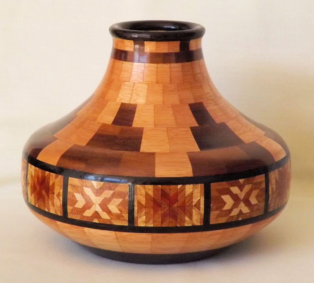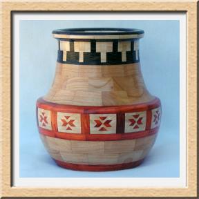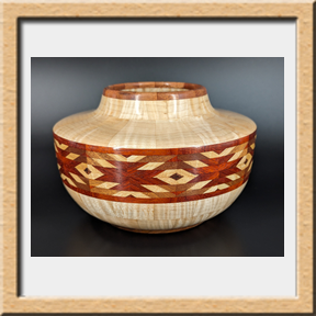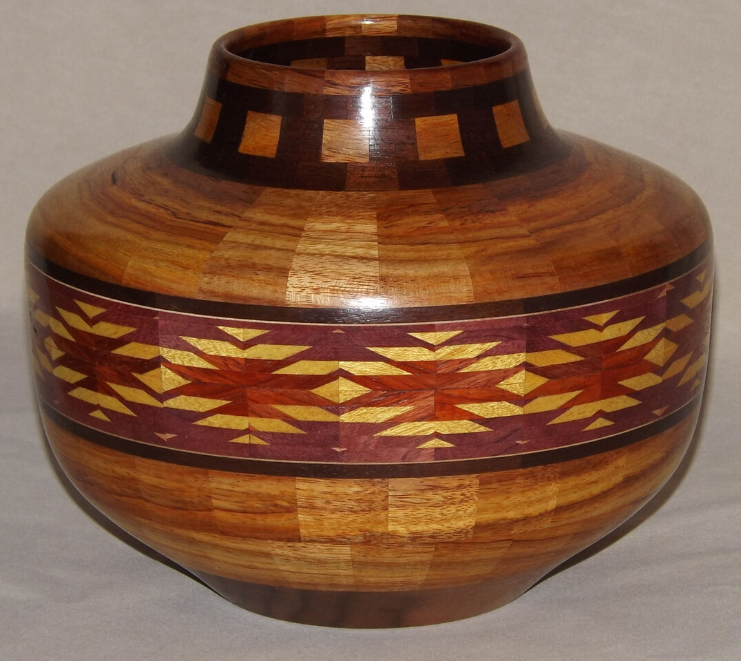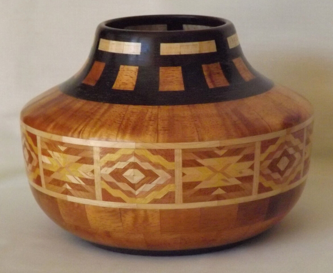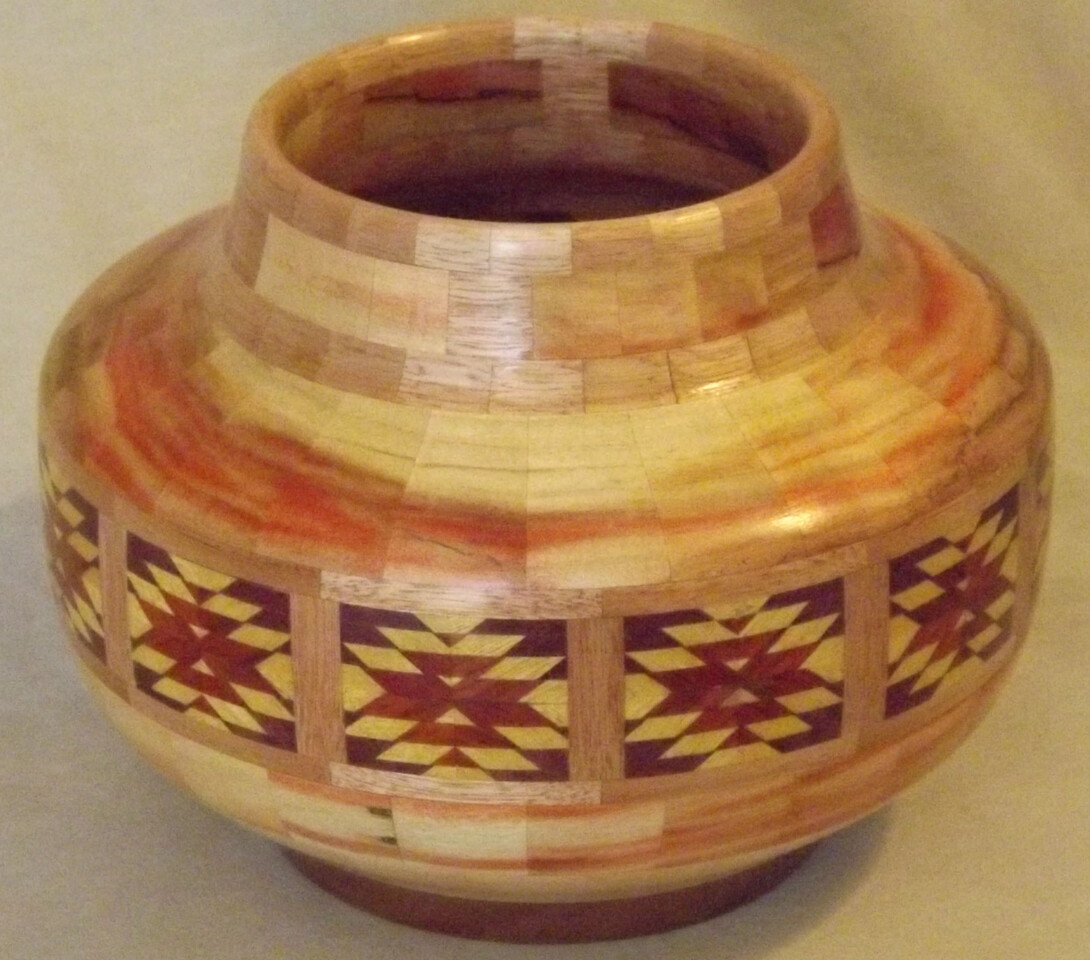I have been asked many times about how the southwest design feature rings in many of these segmented vessels were created. The process includes quite a bit of cutting, gluing and clamping but it is actually a much easier process than most people imagine. I created a simple web page that demonstrates the general principles used to construct these southwest patterns, so check it out if you want to explore using the technique in your own woodworking adventures.