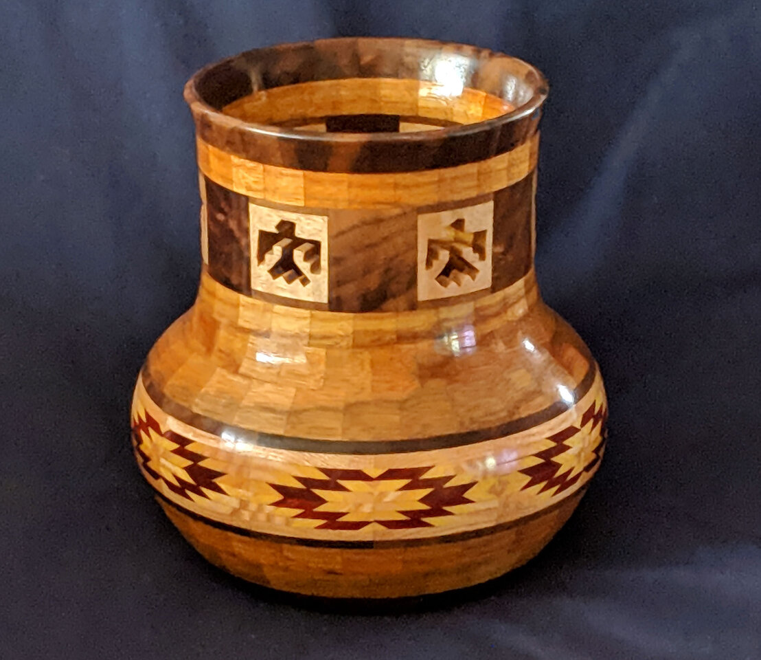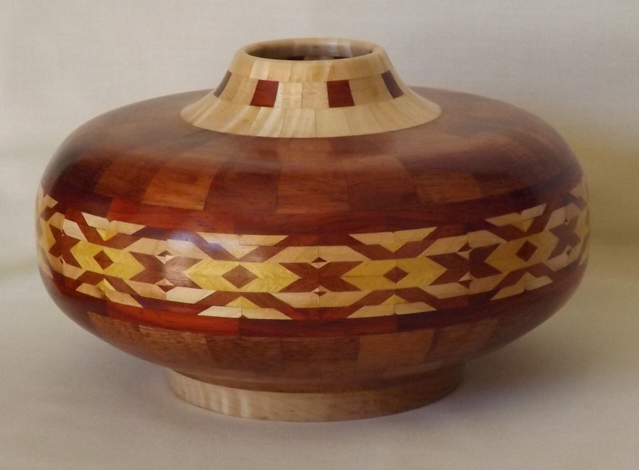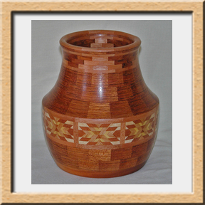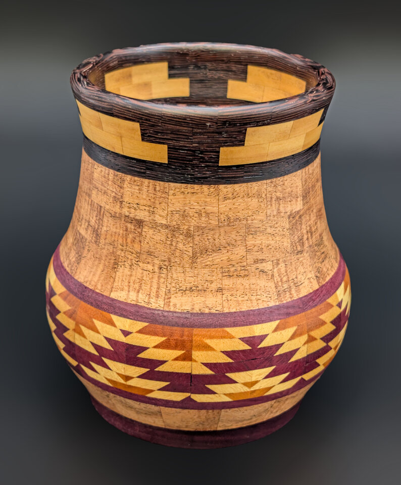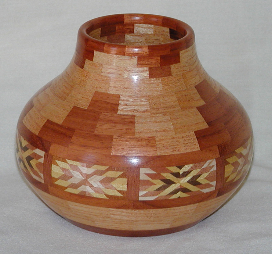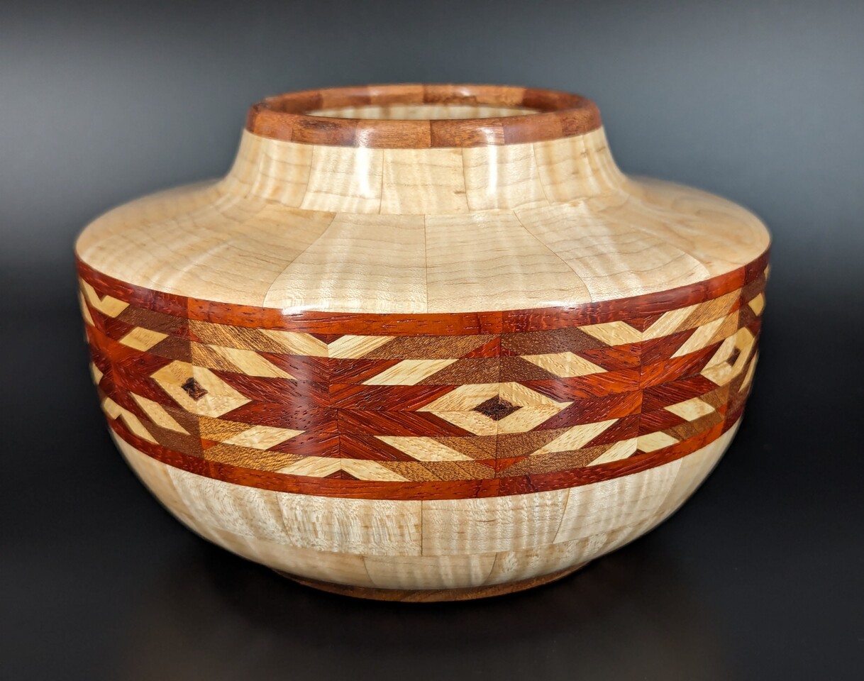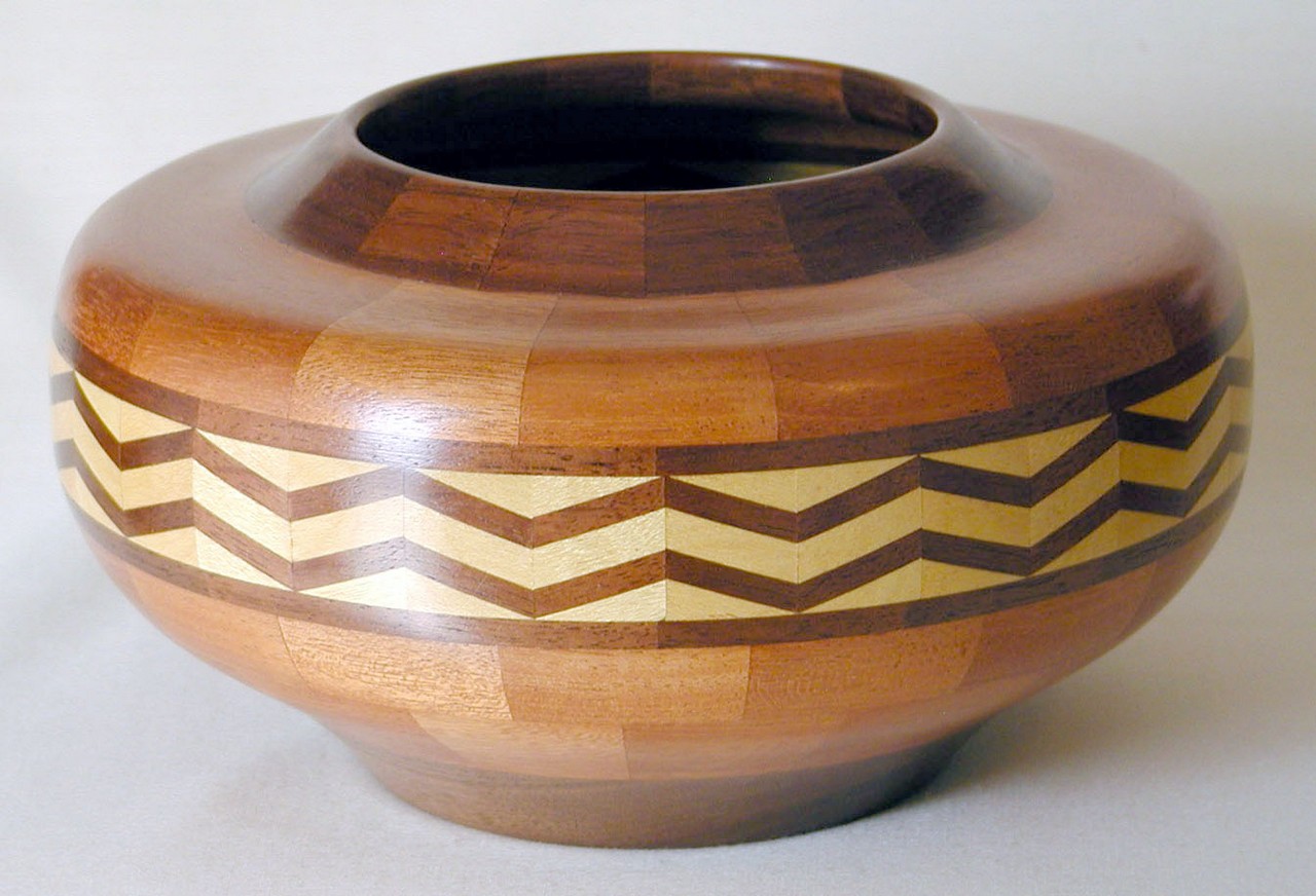 I have been asked many times about how the southwest design feature rings in many of these segmented vessels were created. The process includes quite a bit of cutting, gluing and clamping but it is actually a much easier process than most people imagine. I created a simple web page that demonstrates the general principles used to construct these southwest patterns, so check it out if you want to explore using the technique in your own woodworking adventures.