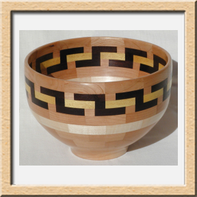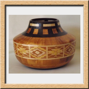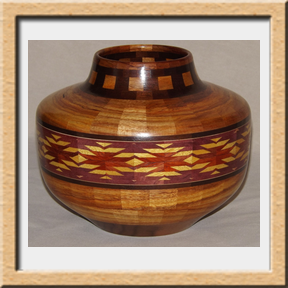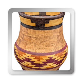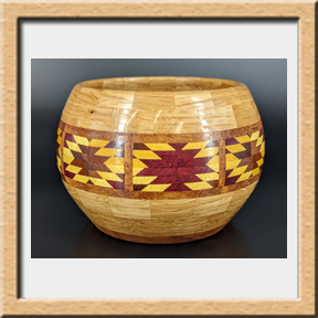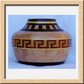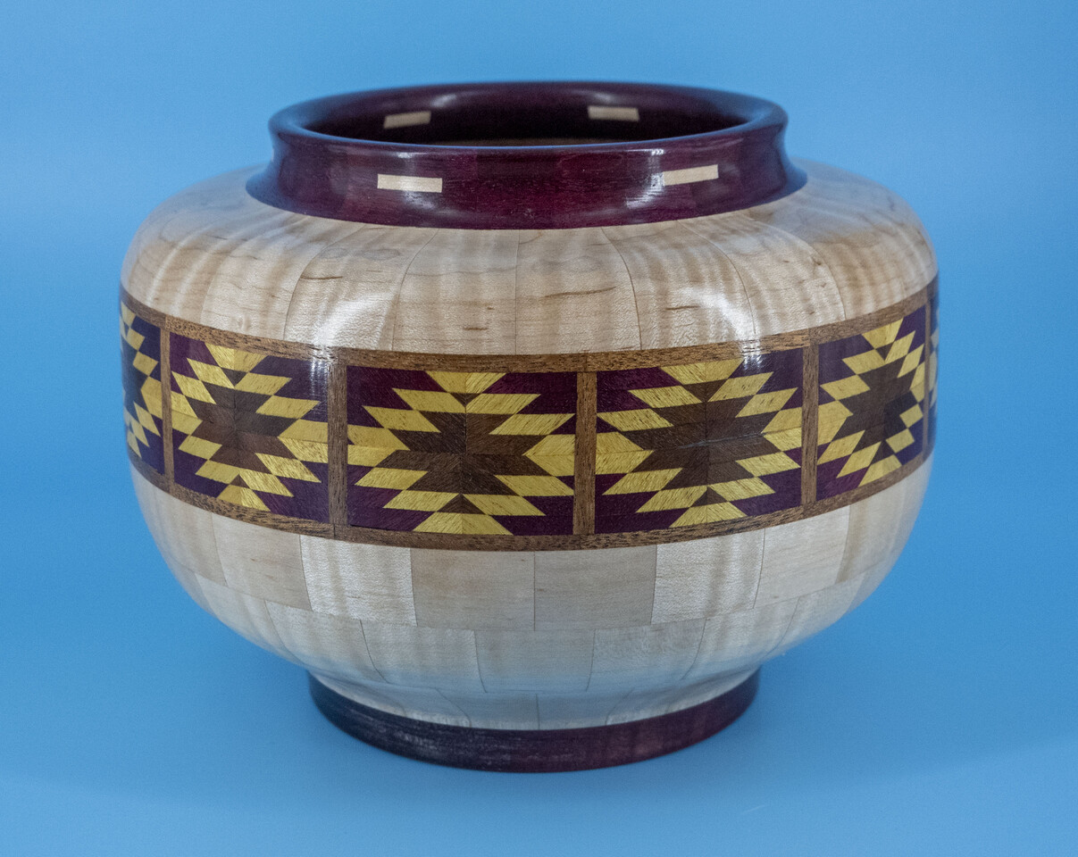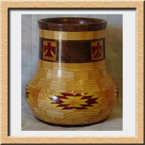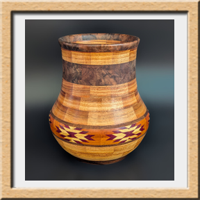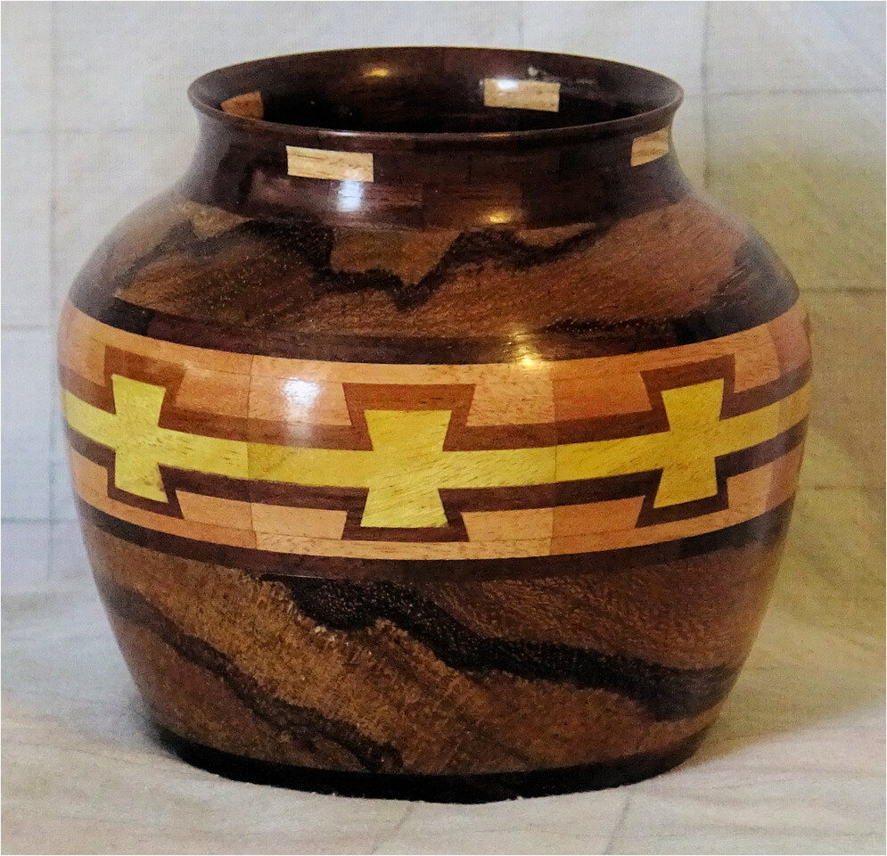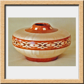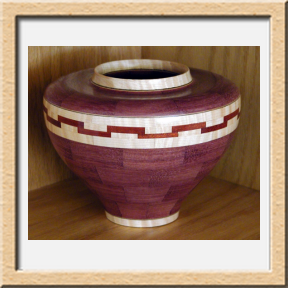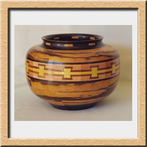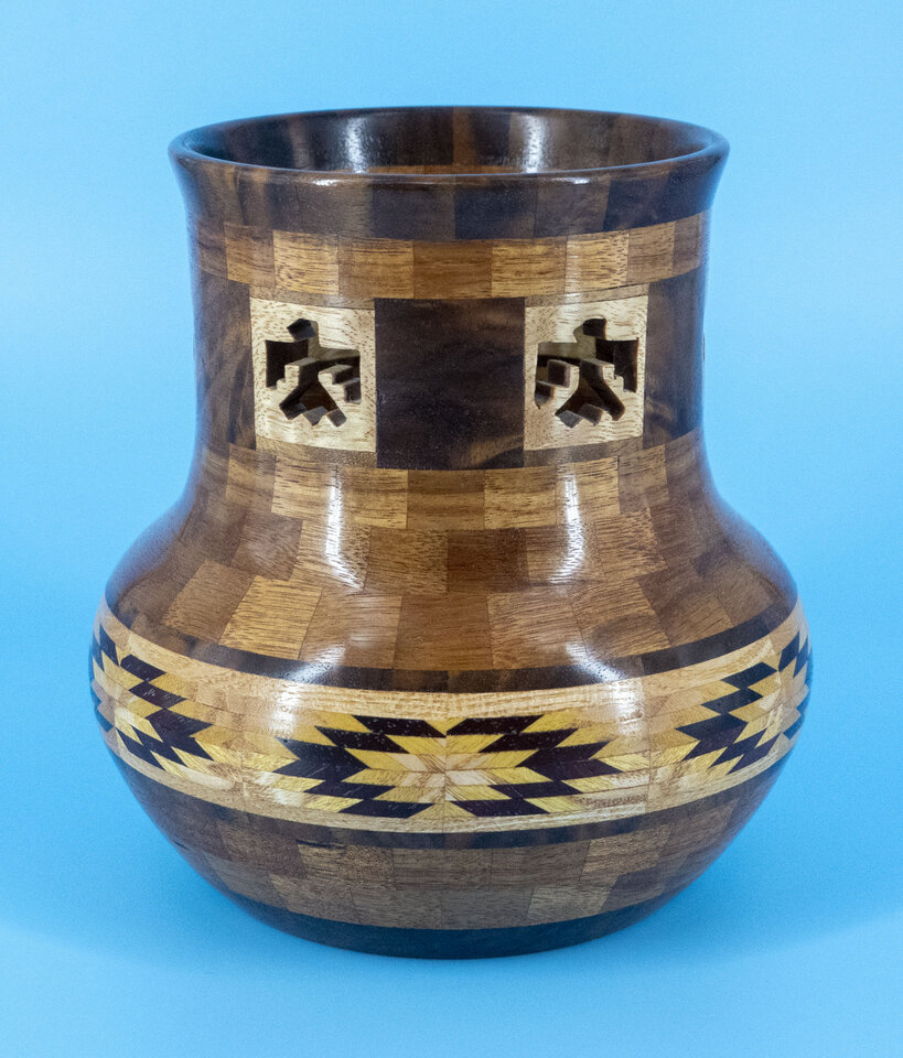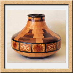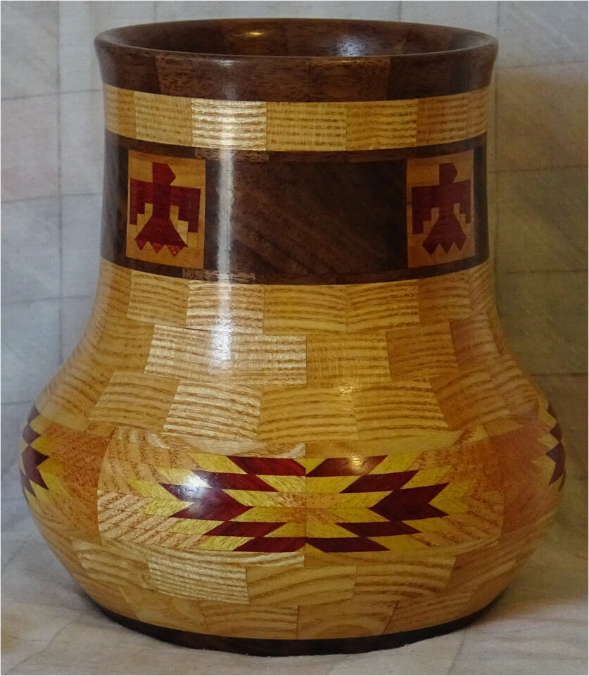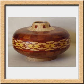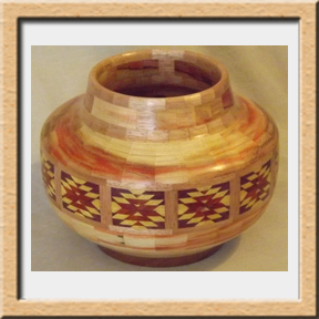 I have been asked many times about how the southwest design feature rings in many of these segmented vessels were created. The process includes quite a bit of cutting, gluing and clamping but it is actually a much easier process than most people imagine. I created a simple web page that demonstrates the general principles used to construct these southwest patterns, so check it out if you want to explore using the technique in your own woodworking adventures.